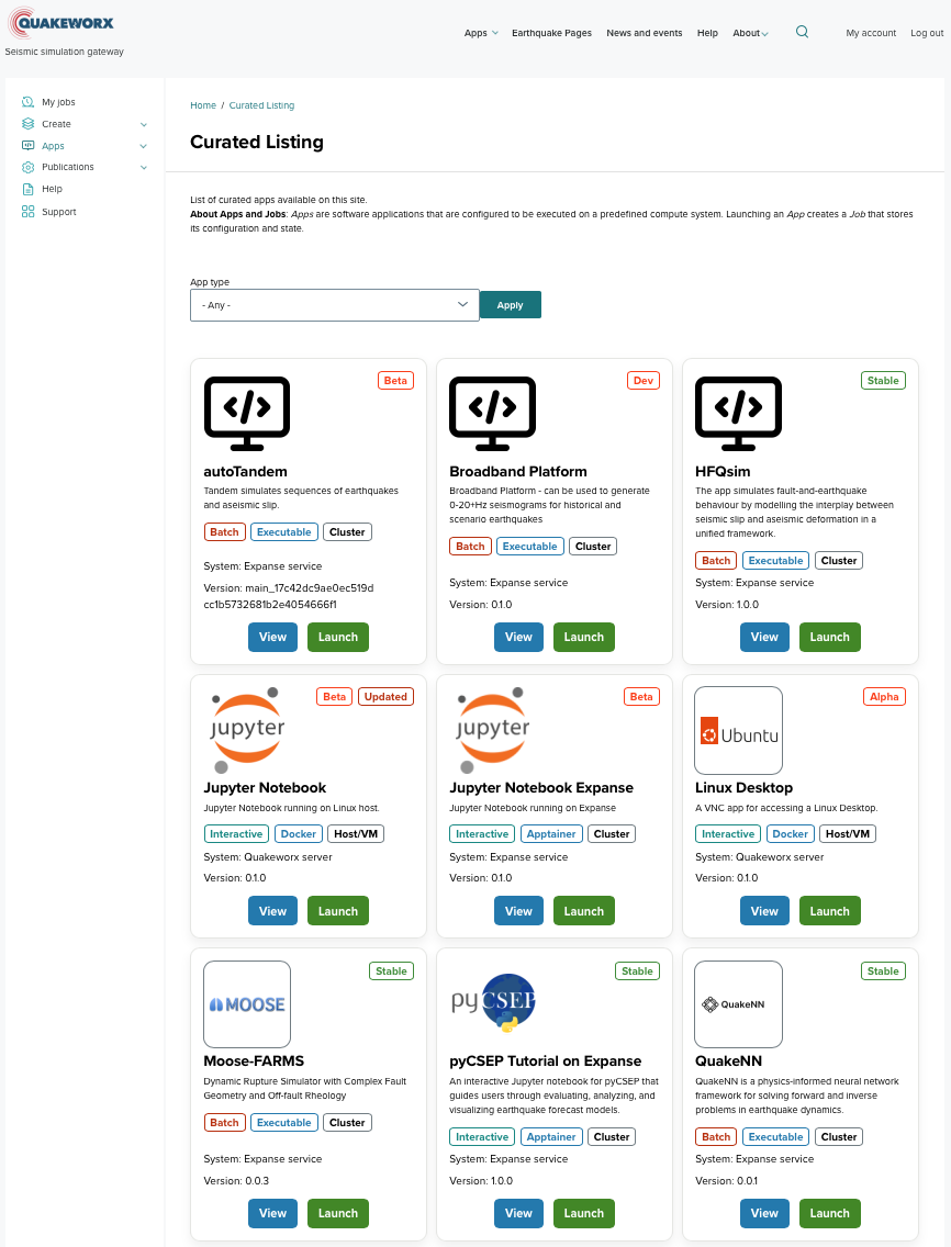 Quakeworx is an extensible framework for earthquake simulations built on OSP. Researchers access domain-specific simulation tools, interactive notebooks, and GUI applications through a single browser-based interface — no command line required.